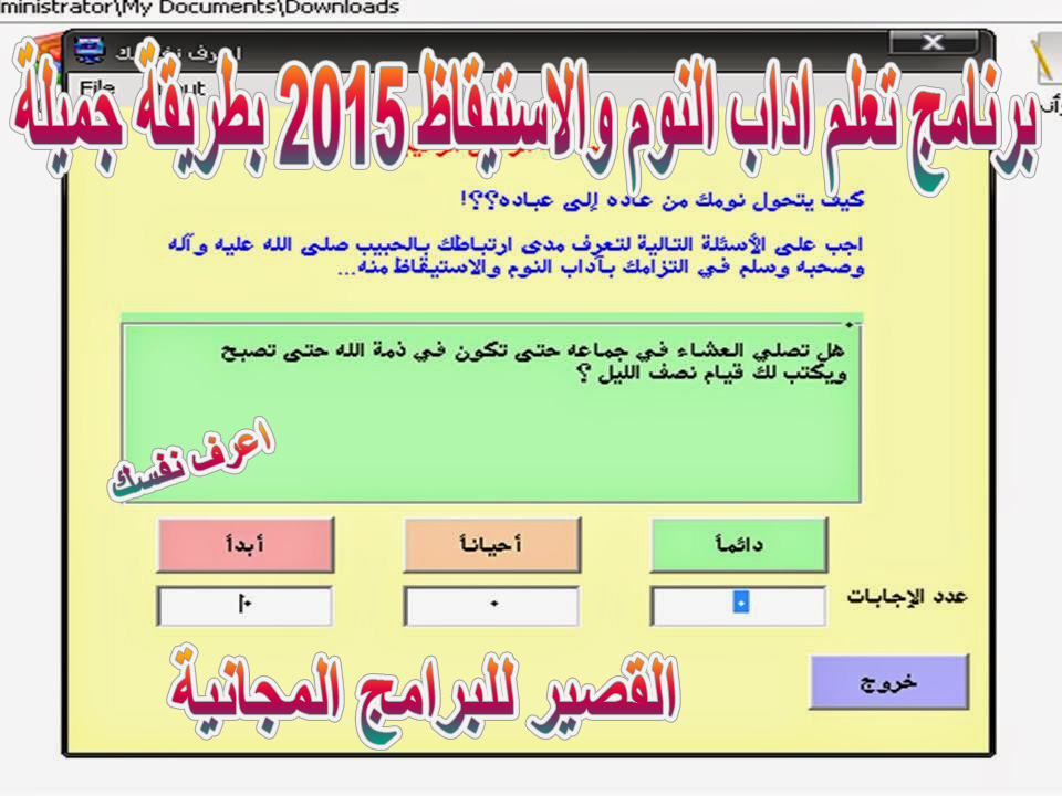 ھو برنامج اسلامي صغير الحجم لتعلم اداب النوم والاستيقاظ من خلال ان يطرح عليك مجموعة من الأسئلة والتي من خلالها يعطيك عدد من النقاط يمكنك من خلالها معرفة نفسك ومعرفة مدي ارتباطك بالحبيب محمد صلى الله عليه وسلم